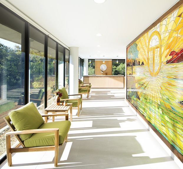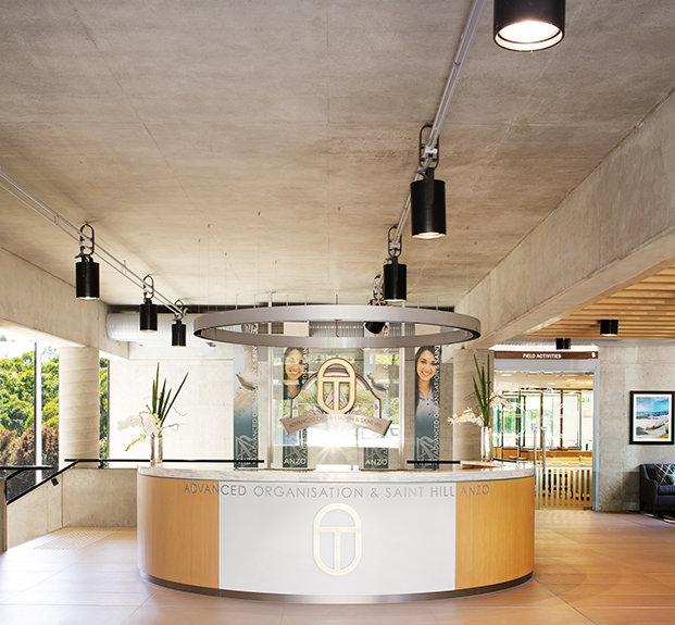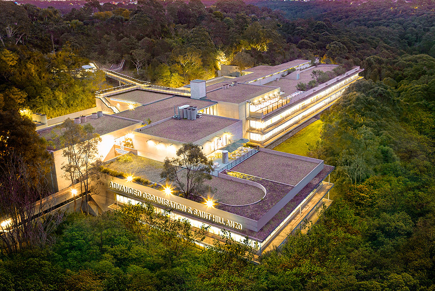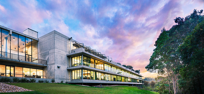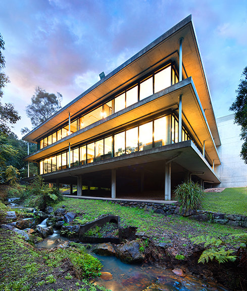 The ultra-modern structure presents a minimalist style with multi-story glass blending into a striking concrete landscape. Outside, the Blue Gum Creek wends its way through the 8.5-acre eucalyptus forest, a virtual Garden of Eden in the heart of Sydney’s metropolitan area.