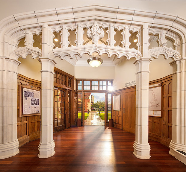 From the red brick and white Oamaru stone fabric used across the façade, to the restoration of delicately finished oak in the entrance hall and library and preservation of rimu timber paneling and jarrah wood flooring, she noted, the work has set the facility apart as a work of art itself.